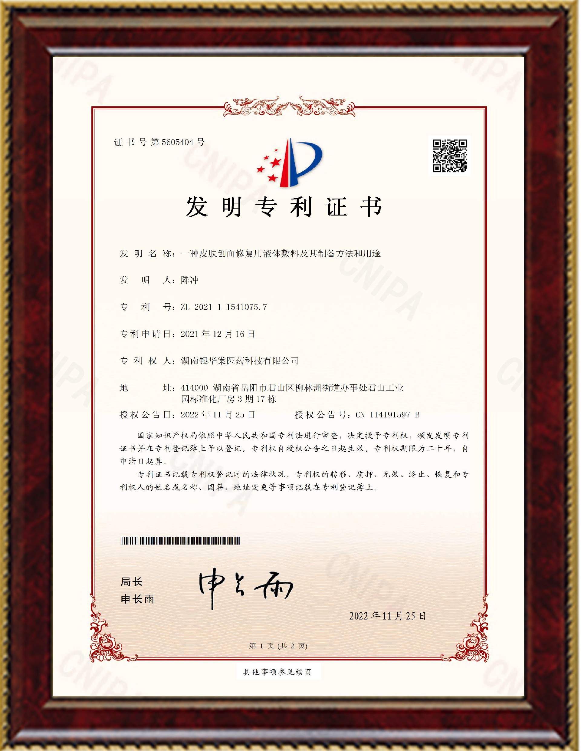 聚焦產(chǎn)品創(chuàng)新,引領(lǐng)行業(yè)發(fā)展,熱烈祝賀銀華棠自主研發(fā)的《一種皮膚創(chuàng)面修復(fù)用液體敷料及其制備方法和用途》獲得國家發(fā)明專利。