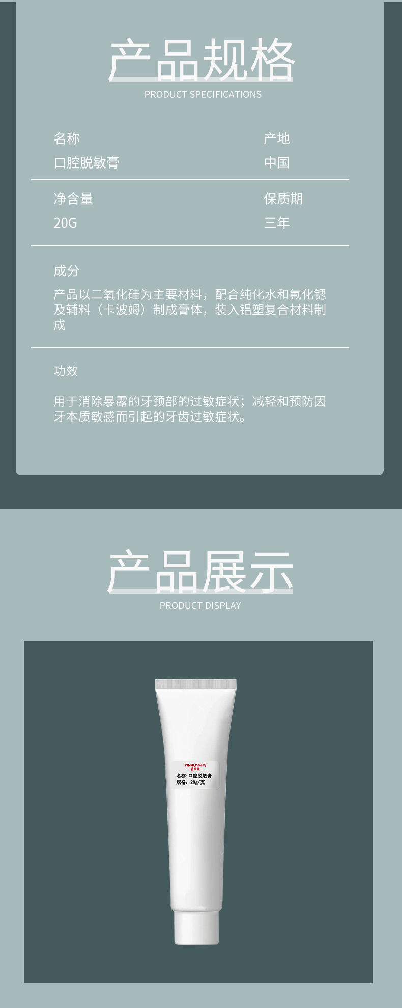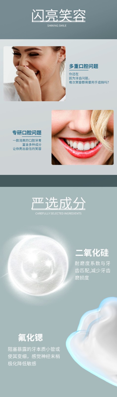 • 組成成分:產(chǎn)品以二氧化硅為主要材料,配合純化水和氟化鍶及輔料(卡波姆)制成膏體,裝入鋁塑復(fù)合材料制成。